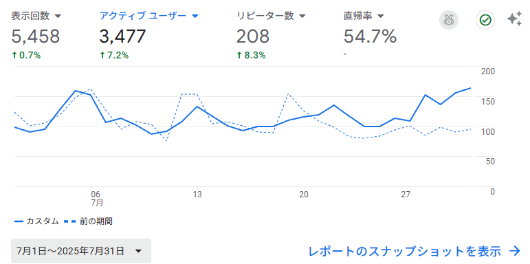 2025年7月期の表示回数とアクティブユーザーは5458PV、3477AU。今だににユニークユーザー(UU)からアクティブユーザー(AU)に指標が変わったことに慣れません。UUのほうが一般的な気がします。