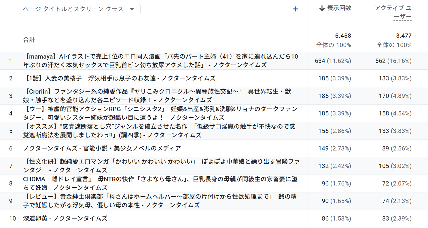 相変わらず「【mamaya】AIイラストで売上1位のエロ同人漫画「バ先のパート主婦(41)を家に連れ込んだら10年ぶりの汗だく本気セックスで巨乳首ビン勃ち放尿アクメした話」」のレビュー記事が突出してPVを集めています。意外なのは拙作の「人妻の美桜子 浮気相手は息子のお友達」が着々と人を集めていることです。サイトのユーザー層が母NTRに偏っているからでしょうかね。