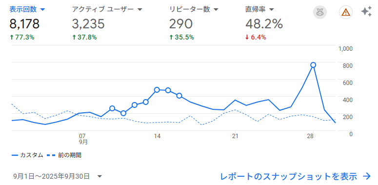8月のお盆休みで落ち込んだPVは回復し、9月中旬から上昇傾向にありました。ただ、これは小説公開の影響が大きいです。ノクターンノベルズでは1日1話としてましたが、ブログ公開は予約が面倒だったので全話を一気に公開。その結果、先行公開になってしまったわけです。