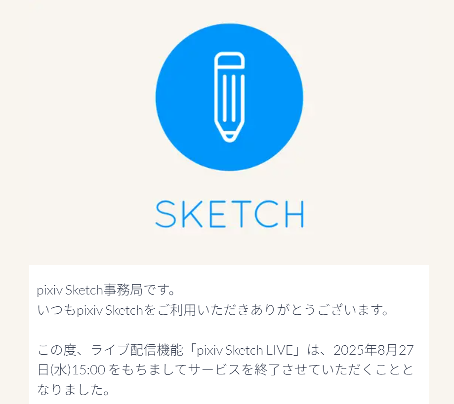 pixivは2025年8月27日、ライブ配信機能「pixiv Sketch LIVE」のサービスを終了する。2017年のリリースから約8年で終了となった。お絵かきコミュニケーションサービス「pixiv Sketch」は引き続き継続する。あわせて、「pixiv Sketch LIVE」内で利用できる「pixivポイント」はサービス終了に伴い、払戻しを行う。iOS版・Android版pixivアプリ内で8月27日以降、払戻し専用フォームを順次公開する。