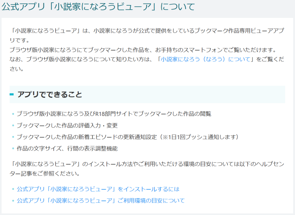 スマートフォンでの閲覧に特化しており、「小説家になろう」「ノクターンノベルズ」「ムーンライトノベルズ」「ミッドナイトノベルズ」でブックマークした作品をアプリ上で読める。本編閲覧時は広告が表示されず、ストレスフリーで作品を楽しめる。