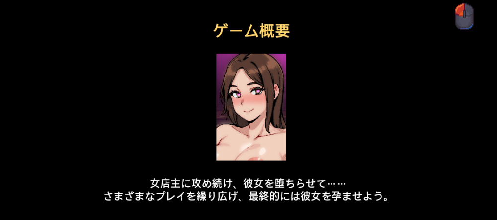 女店主に攻め続け、彼女を堕ちらせて……さまざまなプレイを繰り広げ、最終的には彼女を孕ませよう。