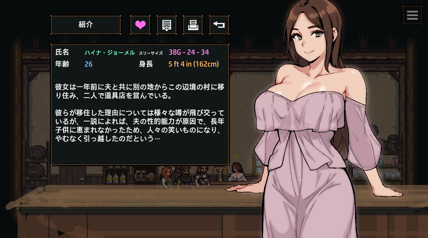 ドット絵の作り込みが凝っている短編的な同人エロゲー。ストーリーは冒険者が人妻の女店主ハイナ(26歳)を寝取る!